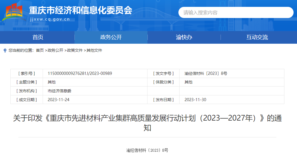 近日,重慶經(jīng)濟(jì)和信息化委員會印發(fā)《重慶市先進(jìn)材料產(chǎn)業(yè)集群高質(zhì)量發(fā)展行動計劃(2023—2027年)》的通知(以下簡稱"通知")。
