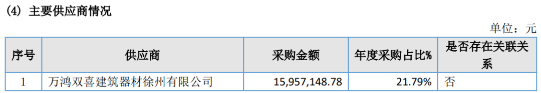 2022年,科網(wǎng)股份的主要供應(yīng)商為萬(wàn)鴻雙喜建筑器材徐州有限公司采購(gòu)金額1595.71萬(wàn)元;上海今寧供應(yīng)鏈有限公司采購(gòu)金額486.47萬(wàn)元;安徽美佳新材料股份有限公司采購(gòu)金額362.41萬(wàn)元;萬(wàn)鴻雙喜集團(tuán)河北有限公司采購(gòu)金額338.69萬(wàn)元;蕪湖合晟機(jī)械設(shè)備科技有限公司采購(gòu)金額246.48萬(wàn)元。