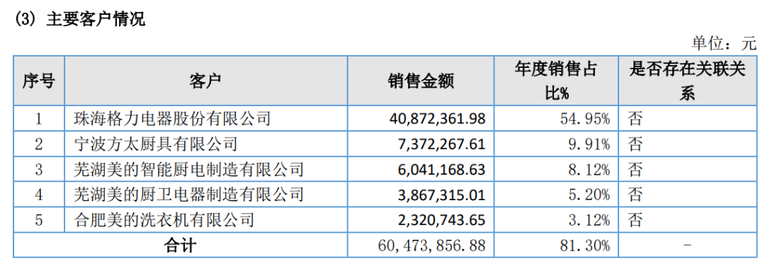 2022年,科網(wǎng)股份的主要客戶有珠海格力電器股份有限公司銷售金額為4087.24萬(wàn)元,同比增長(zhǎng)54.95%;寧波方太廚具有限公司銷售金額為737.23萬(wàn)元,同比增長(zhǎng)9.91%;蕪湖美的智能廚電制造有限公司銷售金額為604.12萬(wàn)元,同比增長(zhǎng)8.12%;蕪湖美的廚衛(wèi)電器制造有限公司銷售金額為386.73萬(wàn)元,同比增長(zhǎng)5.2%;合肥美的洗衣機(jī)有限公司銷售金額為232.07萬(wàn)元,同比3.12%。