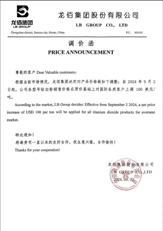 鈦白粉市場(chǎng)再起波動(dòng)。9月2日,龍佰集團(tuán)宣布,自2024年9月2日起,公司各型號(hào)鈦白粉銷售價(jià)格在原價(jià)基礎(chǔ)上對(duì)國(guó)際各類客戶上調(diào)100美元/噸。彰顯出當(dāng)前鈦白粉國(guó)際市場(chǎng)的復(fù)雜態(tài)勢(shì)。