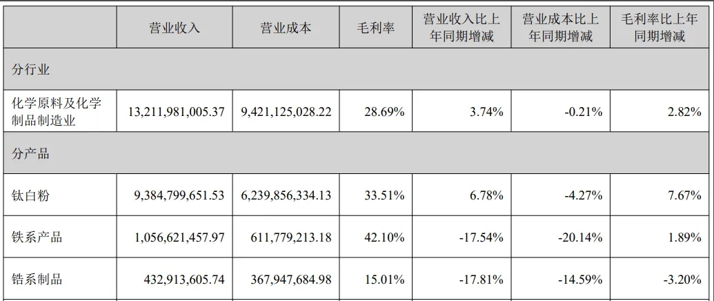 其中,鈦白粉業(yè)務(wù)實(shí)現(xiàn)營(yíng)收93.85億元,同比增長(zhǎng)6.78%,占總營(yíng)收比重為68.05%;海綿鈦實(shí)現(xiàn)營(yíng)收13.19億元,同比增長(zhǎng)21.47%,占總營(yíng)收比重為9.56%。