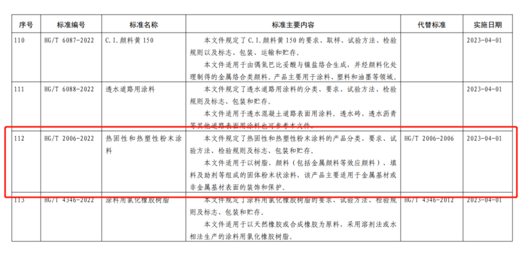 近日,工業(yè)和信息化部發(fā)文(中華人民共和國(guó)工業(yè)和信息化部公告 2022年第23號(hào))批準(zhǔn)發(fā)布了10項(xiàng)涂料、顏料化工行業(yè)標(biāo)準(zhǔn)。該10項(xiàng)標(biāo)準(zhǔn)將于2023年4月1日正式實(shí)施。其中附件1中1036 項(xiàng)行業(yè)標(biāo)準(zhǔn)第112項(xiàng)是關(guān)于粉末涂料的行業(yè)標(biāo)準(zhǔn)更新,HG/T 2006-2022《熱固性和熱塑性粉末涂料》將代替原HG/T2006-2006《熱固性和熱塑性粉末涂料》。